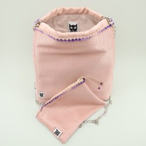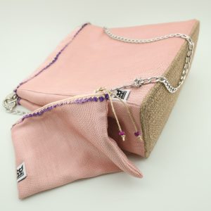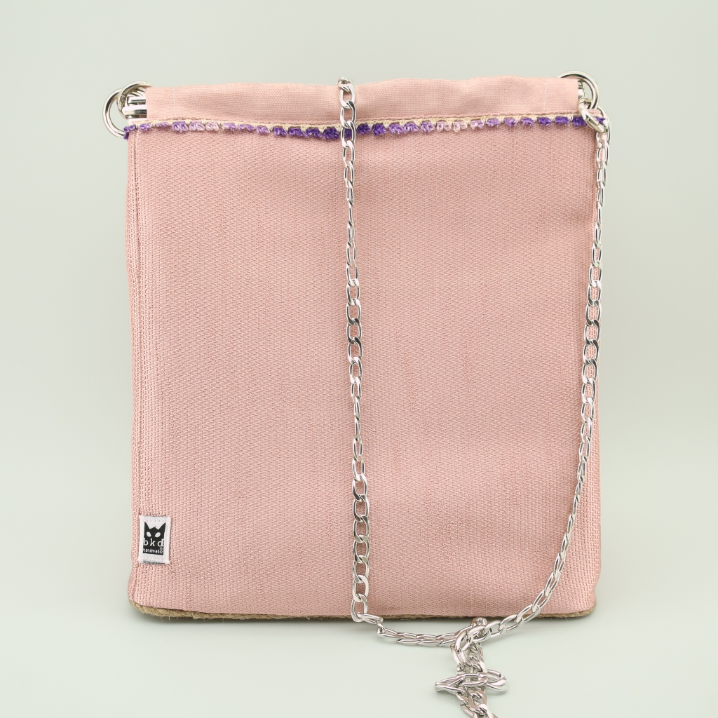 Çanta gövdesi şık, hafif parlak toz pembe dokuma kumaş, iç astarı toz pembe renk saten kumaştır.