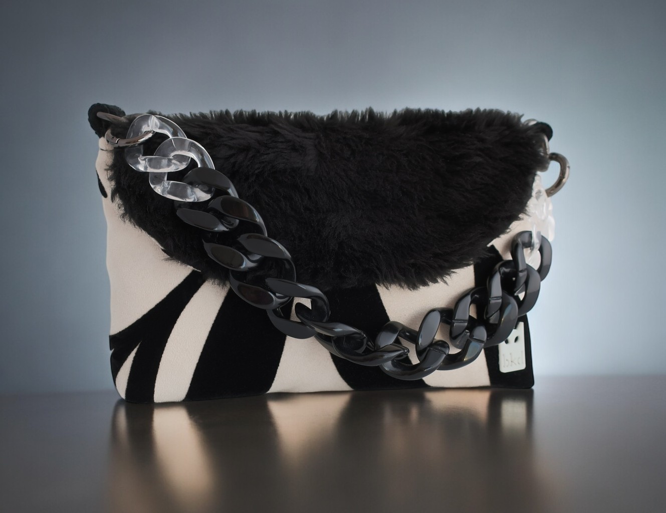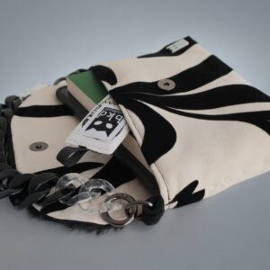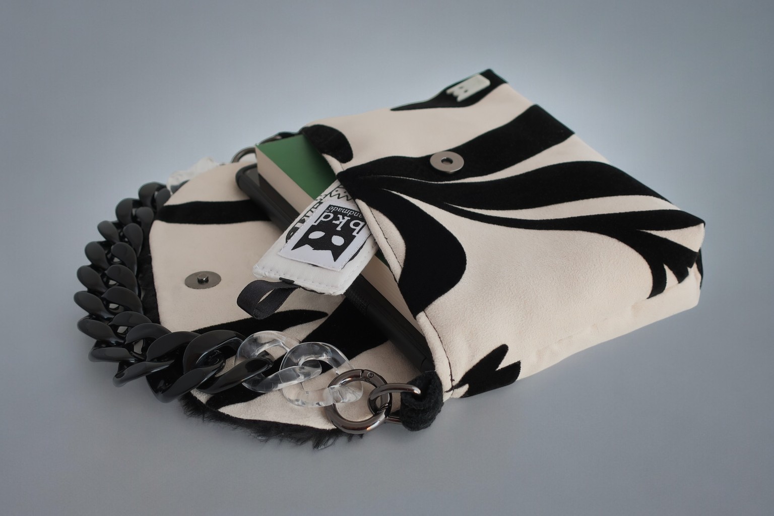 Çanta gövdesi siyah – beyaz Kadife , Kapak detayı Peluş, İç astarı siyah Saten kumaştır