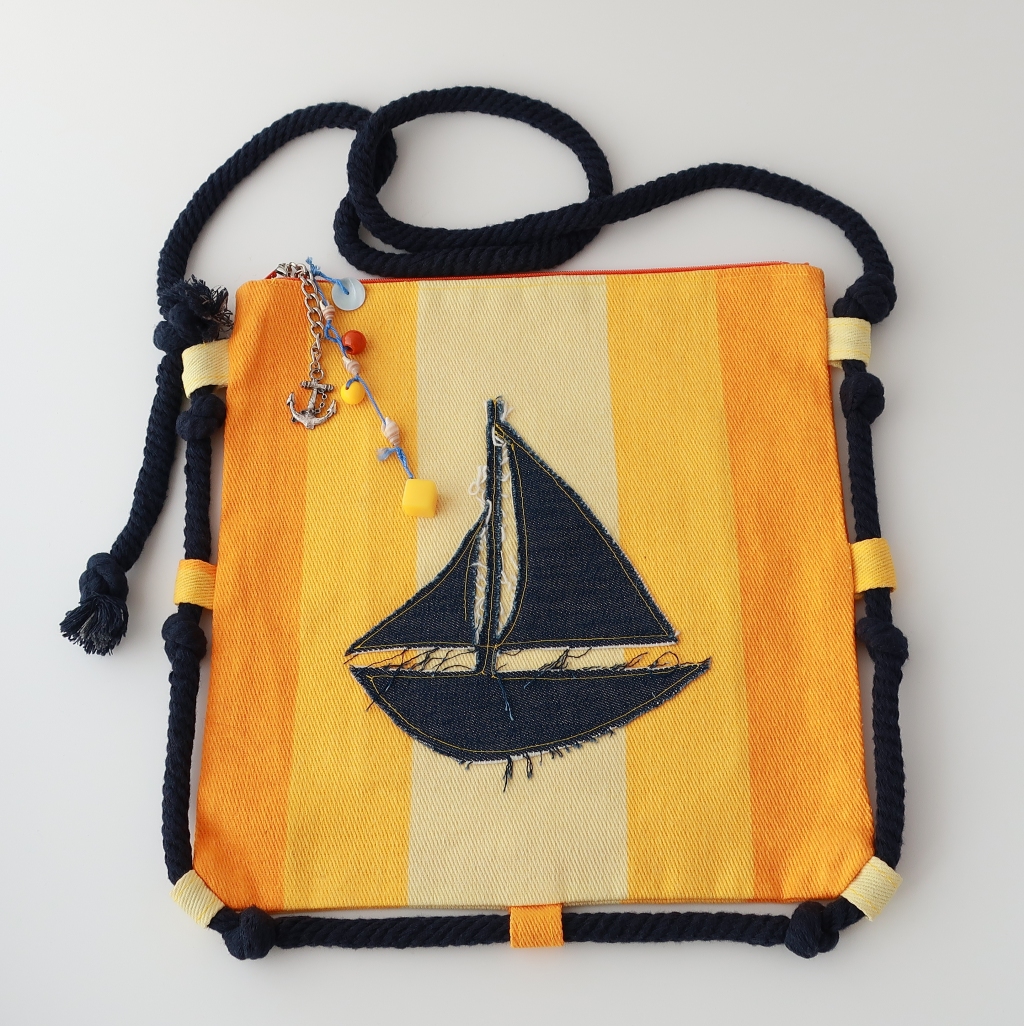 Sarı- turuncu kanvas kumaş üzerinde yelkenli el işlemeli