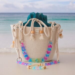 İç astarlı, 1 iç cepli, büzgü kapamalı, ahşap boncuklu, renkli akrilik askı (uzun ve kısa askı)