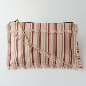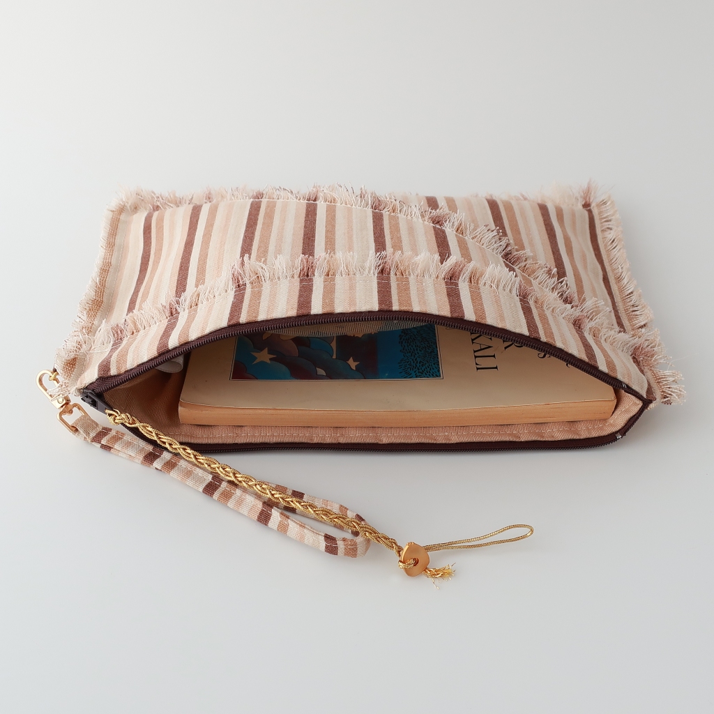 Çizgili keten kumaşla tasarlandı, dore aksesuarla bezendi